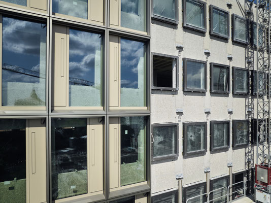 Gemeinsam mit WICONA bereiten wir die Bauteile so auf, dass sie als hochwertige Ressource für neue, besonders CO₂-arme Fassadenelemente dienen. Der laufende Rückbau legt damit die Grundlage für ein konsequent zirkuläres Bauprojekt und reduziert den Einsatz neuer Rohstoffe auf ein Minimum.